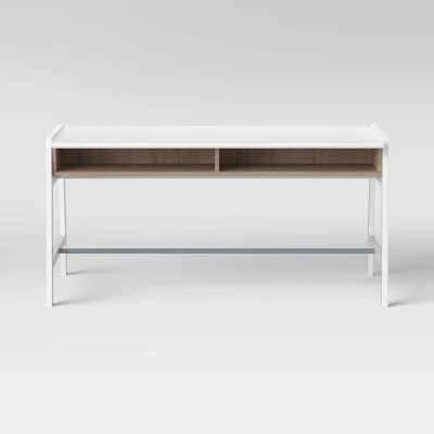 They’ll love reading books, drawing pictures and enjoying a variety of other activities at this cute and convenient Bly Kids’ Activity Table from Pillowfort™. Designed with a long, rectangular tabletop and trestle base, this kids’ desk is perfect for creating a designated area for them to do homework or get creative with arts and crafts. The white finish on the wood veneer coordinates easily with a wide variety of room decor, while the sides and two built-in open storage cubbies boast a contrasting accent color with their natural wood finish. Style it solo with a lamp and chair, or coordinate with other pieces from the Pillowfort Bly Kids’ Collection for a tidy matching look.