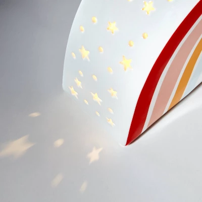 Bring some magical charm to their room with this Rainbow Dual-Light Lamp from Pillowfort™. Crafted with a ceramic body and topped off with a white textured drum shade for lovely lighting, this dual-light lamp comes with rainbow detailing at the base for a whimsical look, while the flat base adds stability for standing on a nightstand. Plus, the two-way light setting cast the perfect glow for reading or writing and is simple to turn off when it’s time to turn in for the night.